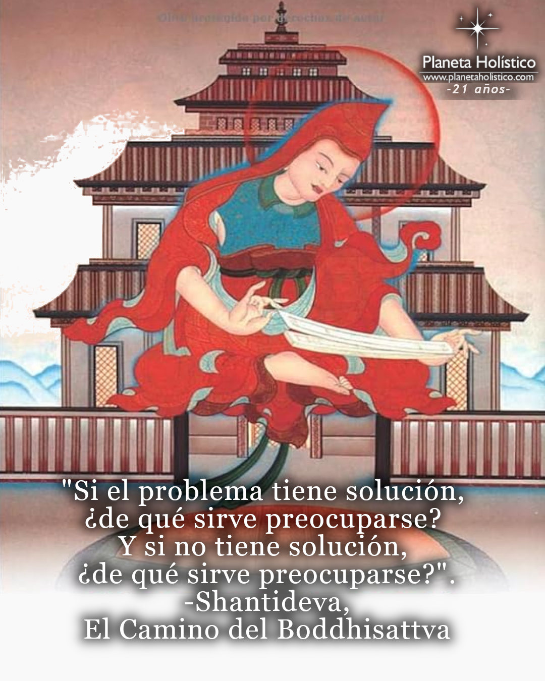 Shantideva (c. 685-763 d.C.) fue un monje budista indio, filósofo y poeta del siglo VIII, asociado a la gran universidad monástica de Nalanda. Según la tradición, nació como príncipe en la región de Bengala (India oriental). Tras una visión de Manjushri, renunció al trono y se ordenó monje. Es autor del Bodhicharyāvatāra (Guía para la vida del bodhisattva o Entrada en la práctica del bodhisattva), una obra maestra del budismo Mahāyāna que describe el camino altruista hacia la iluminación, y del Śikṣāsamuccaya. Su texto sigue siendo una referencia esencial para el Dalai Lama y millones de practicantes.